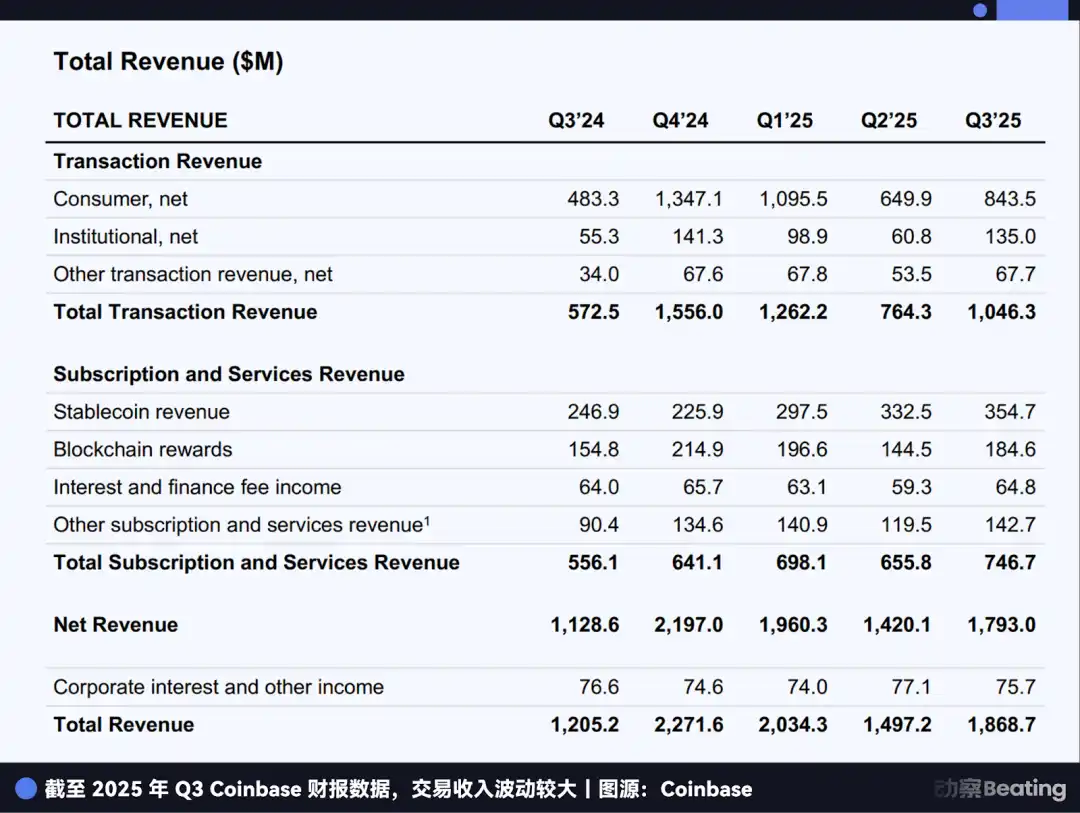 根据动察 Beating 的整理,2025 年 Q3 Coinbase 的收入就达到了 354.7M,是同时期 Circle 自己利息收入 711M 的 50%。换句话说,Circle 赚到的每 2 美元利息,就要分给 Coinbase 1 美元。