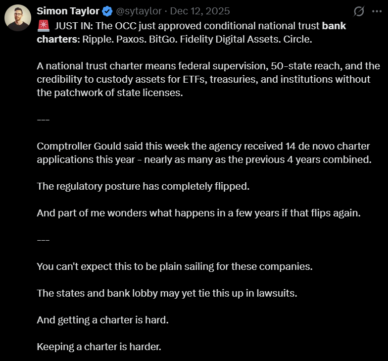近期,特朗普相关的World Liberty Financial也递交了全国性银行牌照申请,加剧了加密及金融科技企业入局美国银行体系的竞争。