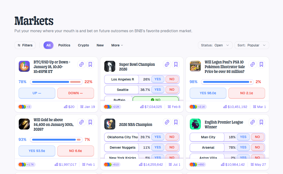 predict.fun 为预测市场平台并在 BNB Chain 上线,创始人为此前 NFT 领域知名人物 dingaling。与 Polymarket、Kalshi 等传统预测市场不同,predict.fun 实现了一项关键创新:用户参与预测的资金不再闲置,而是可以在预测期间同时产生额外收益。