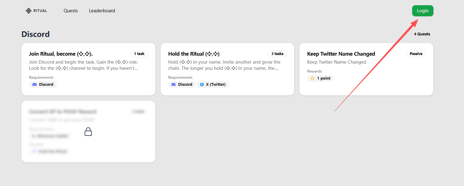 STEP 1. 进入交互网站(链接:https://ritual-synful.domino.page/quests),点击右上方的 Login,通过 X 账号进行登录。