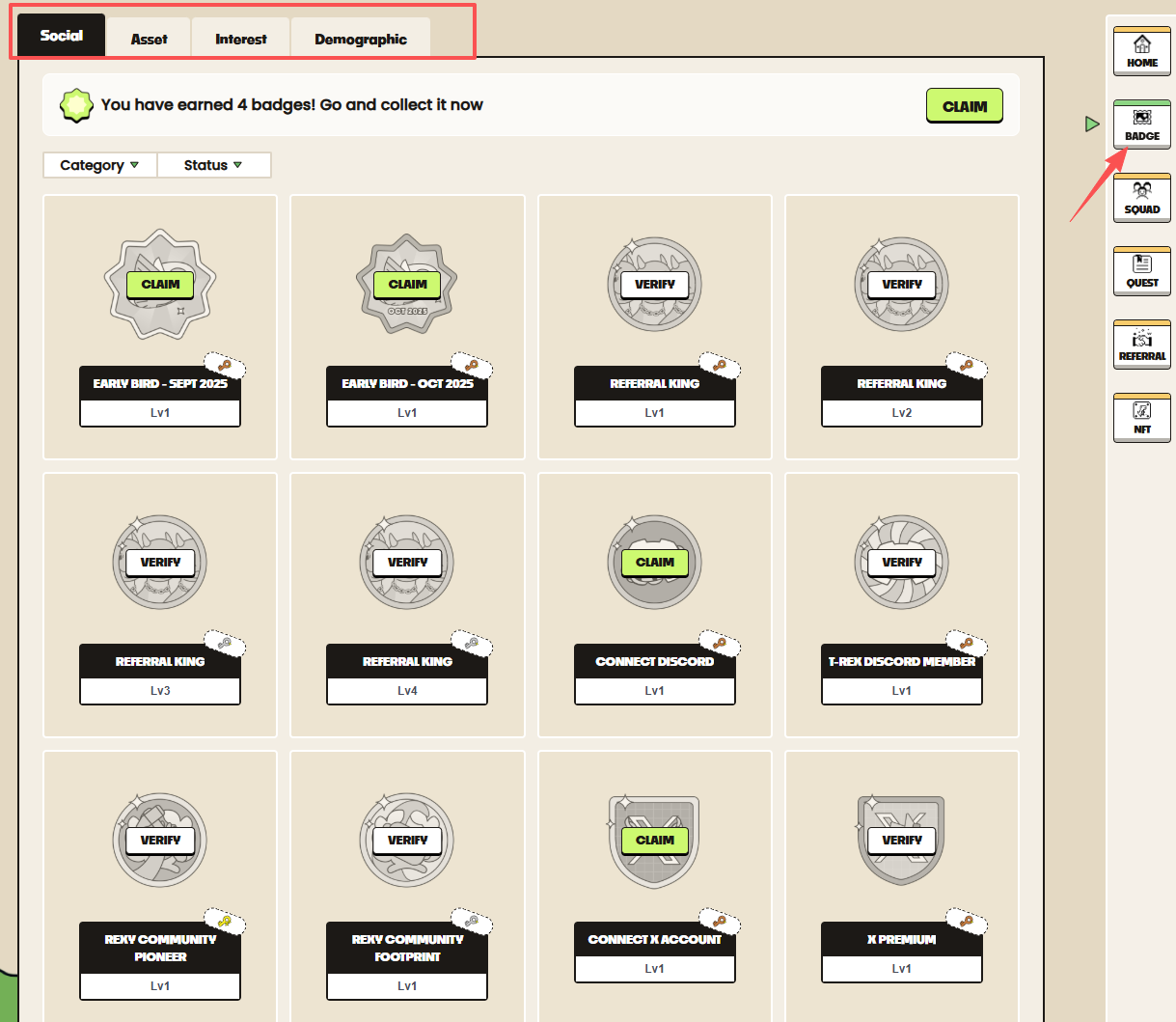 STEP 4. 点击右侧的“BADGE”,完成对应任务解锁对应徽章。