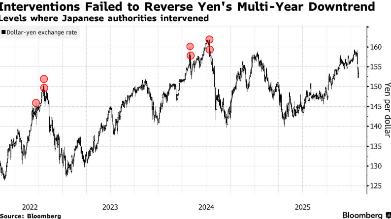 历史表明,单边行动只能带来短暂的缓解。日本在2024年干预了四次,每次都短暂拉升日元,但都未能扭转其多年来的整体下跌趋势,市场反复试探了政策制定者的决心。