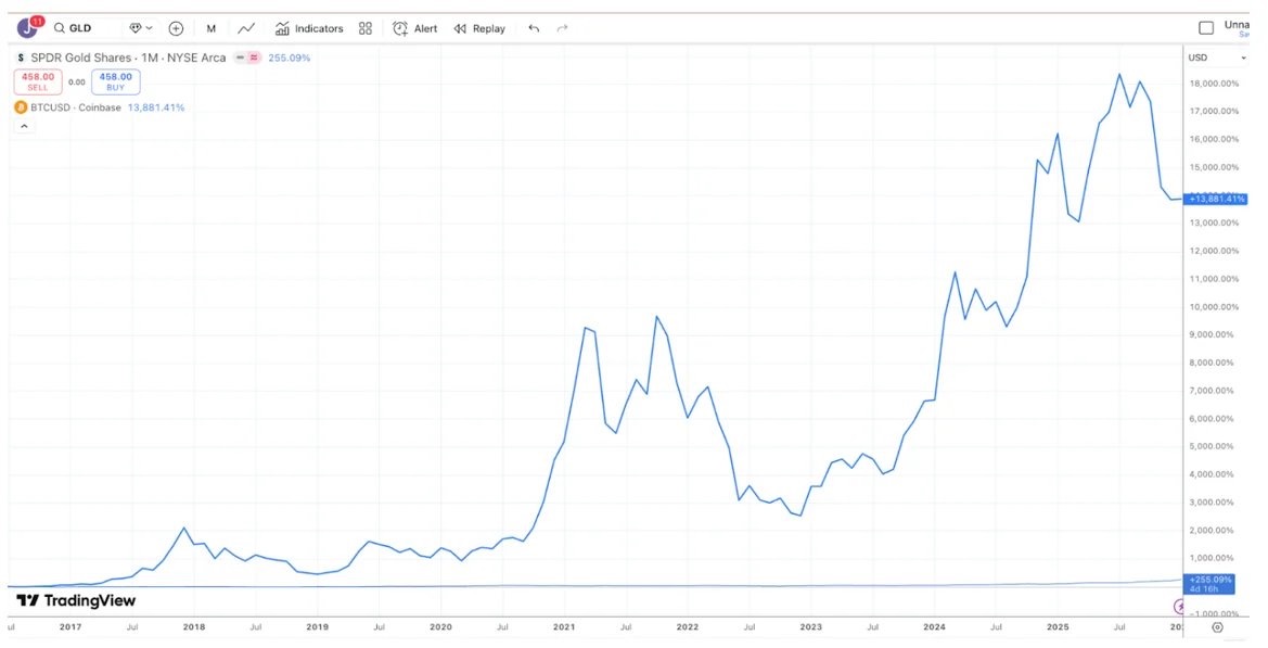 来源 TradingView,过去 10 年比特币(BTC)与黄金(GLD)的收益对比
