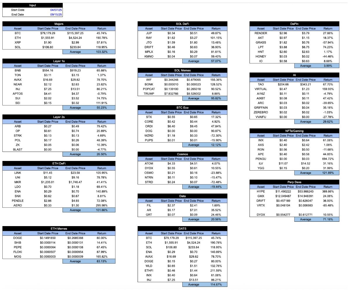 在市场繁荣时期,这张表看起来会稍微令人鼓舞一些。「好」代币的表现往往优于「坏」代币。但一个健康的系统其实应该相反:你希望好的代币在糟糕的时期也能表现得更好,而不仅仅是在行情好的时候。以下是 4 月 7 日低点到 9 月 15 日高点的同一张表。