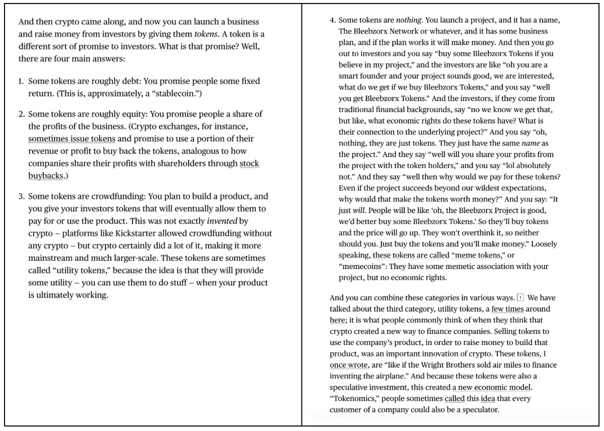 这就是为什么Matt Levine 最近写的那篇关于代币的文章如此令人惊讶且受欢迎。仅用短短 4 个段落,Levine 就准确描述了各种代币之间的差异和细微差别。这给了我一些希望,说明这类分析依然可行。