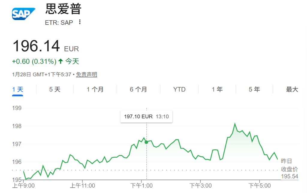 SAP在四季度交出了超出市场预期的成绩单。云收入217亿欧元的全年业绩好于分析师此前预测。公司股价周三上涨0.3%至196.14欧元,尽管较去年2月创下的历史高点仍下跌30%,但SAP依然保持德国市值最高公司的地位。