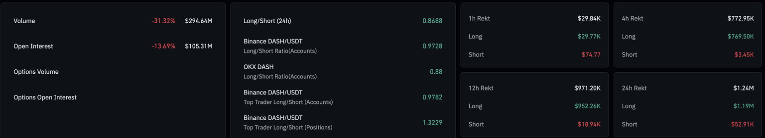 衍生品方面,DASH期货未平仓合约(OI)在过去24小时内下降13.69%至1.0531亿美元,表明资金流出主要由多头平仓和避险情绪驱动。过去24小时内多头平仓总额为119万美元,超过空头平仓的5.291万美元,进一步巩固了看跌趋势。