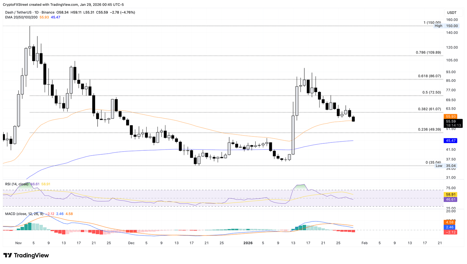 Dash 面临更大幅度回调至 50 美元的风险。