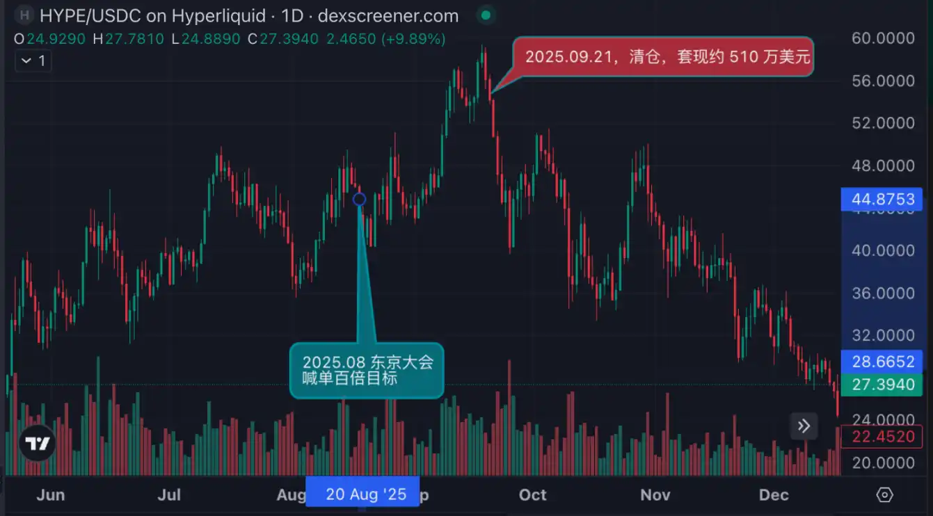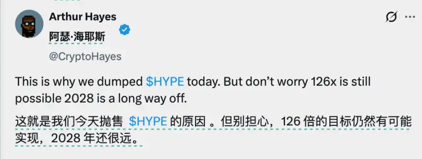 例如,去年 8 月,Hayes 在东京的大会上预言 HYPE 会有百倍增长,并且高调买入,仅仅 1 个月后,他就在 HYPE 下跌前清空仓位并获利数百万美元时,给出的理由是「规避解锁风险」。