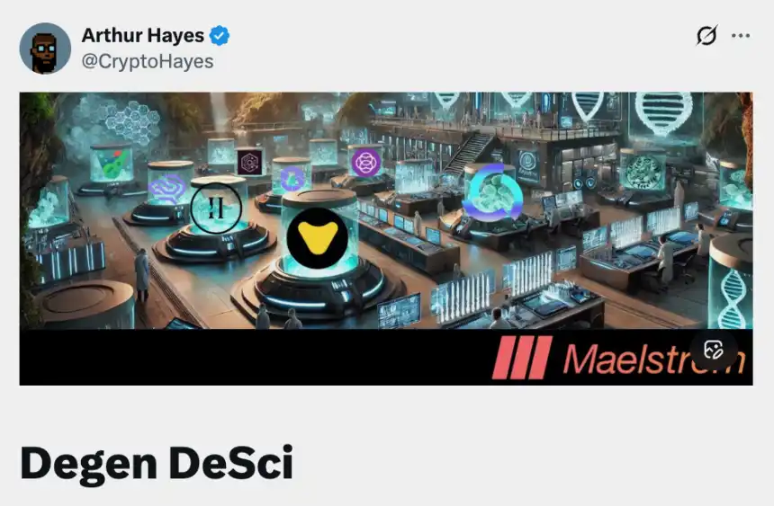 2025 年初,他的家族基金 Maelstrom 写了一篇很长很深奥的文章《Degen DeSci》,大力看好 DeSci(去中心化科学)赛道。他列了一份清单,又是 BIO 又是 GROW ······