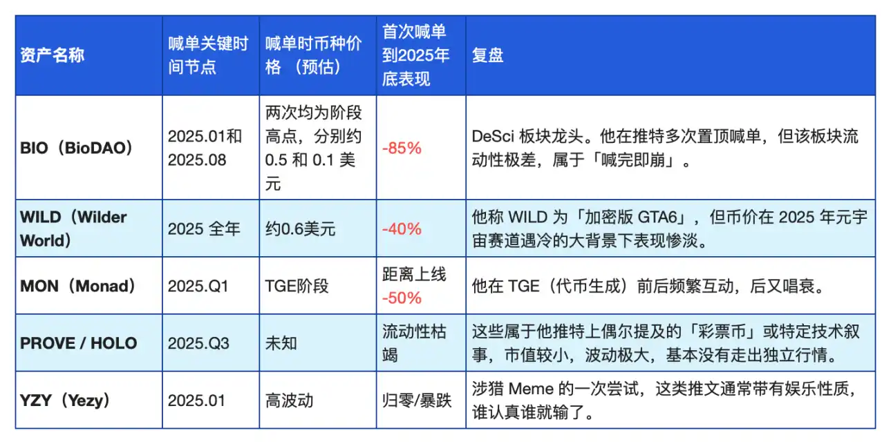 Hayes 喊单的大多是特定阶段有热度的代币,总结如图所示: