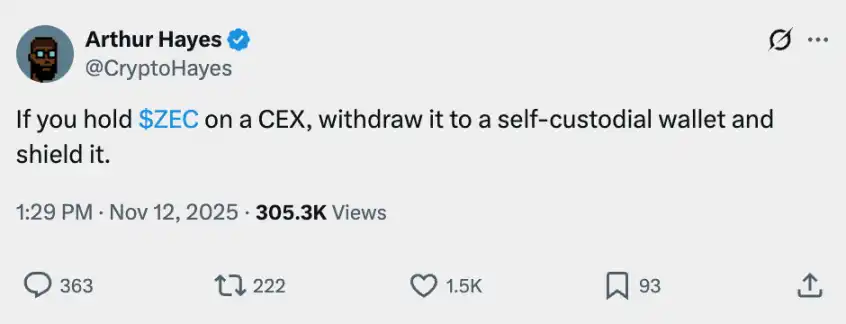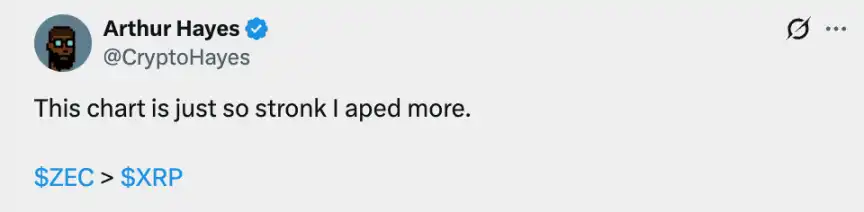 表面上看,Hayes 疯狂喊单 Zcash(ZEC),其表示最初是在 Token 2049 的私人晚宴上听了硅谷大佬 Naval 的建议后,当场买入数百万美元。他在去年 11 月喊出了「目标 1 万美元」的口号。