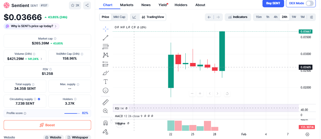 目前,Sentient 的价格接近 0.036 美元。就在几天前,其价格还接近 0.022 美元。这一快速上涨使 SENT 成为关注焦点,并使其成为当日表现最佳的 AI 代币之一。
