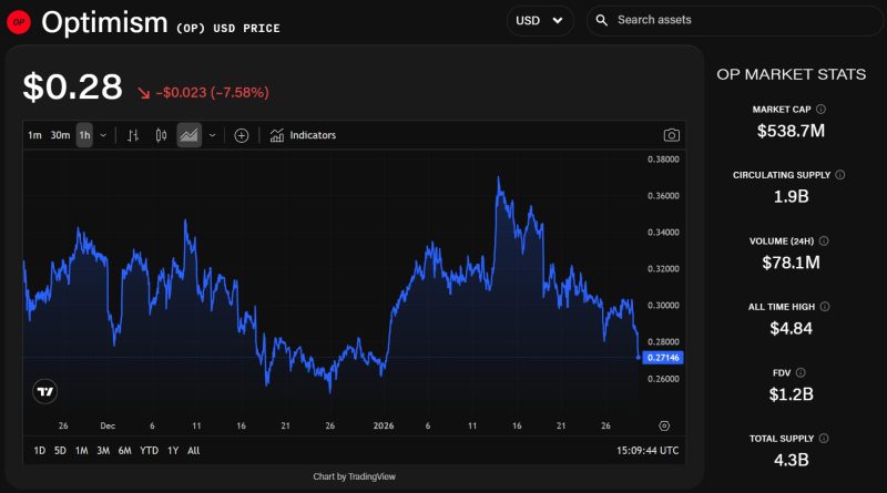 受整体市场回调影响,OP当日跌幅超过8%,比特币下跌2.2%,以太坊下跌2.9%。The Block 的价格页面.