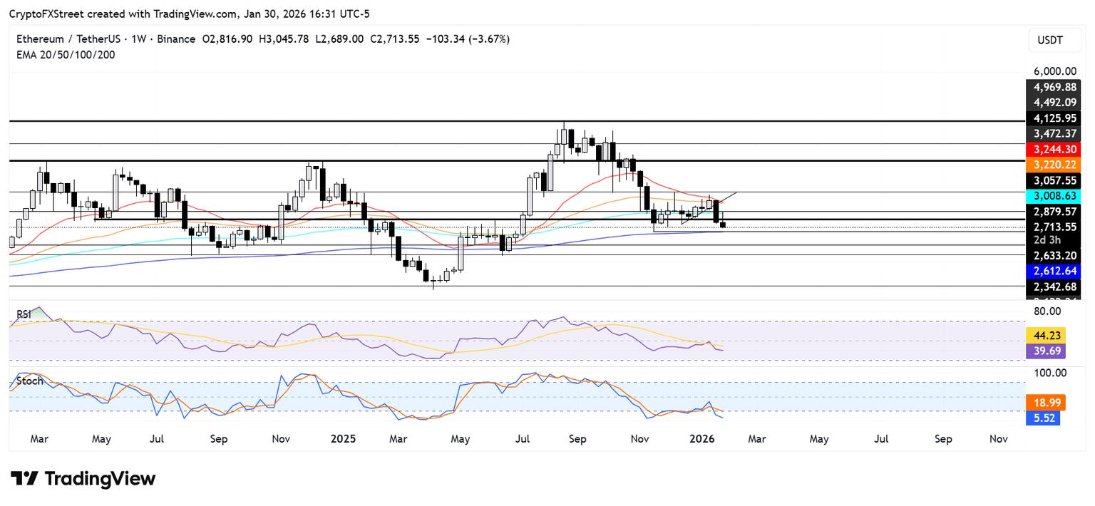 以太坊 (ETH) 在 3060 美元阻力位附近(靠近 100 周指数移动平均线 (EMA))遭遇阻力后受阻,目前正接近 2630 美元的支撑位。200 周 EMA 进一步加强了 2630 美元的支撑位,多头曾在去年 6 月和 11 月成功守住该支撑位。