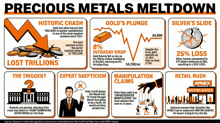 金子期货价格跌破5000美元,白银在惨淡的交易日中跌幅超过25%。