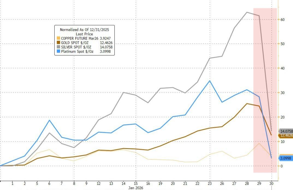 华尔街见闻提及,周五特朗普提名沃什出任美联储主席,引爆了贵金属“血洗”。黄金暴跌10%,过去两天抹去了5万亿市值。现货白银一度暴跌37%,现货铂金重挫逾16%,纽铜则回吐昨日全部涨幅。