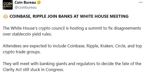 本次会议由白宫加密货币委员会牵头,将汇聚高级政府官员、主要银行和领先的数字资产公司,以期推动陷入停滞的《CLARITY法案》取得进展。