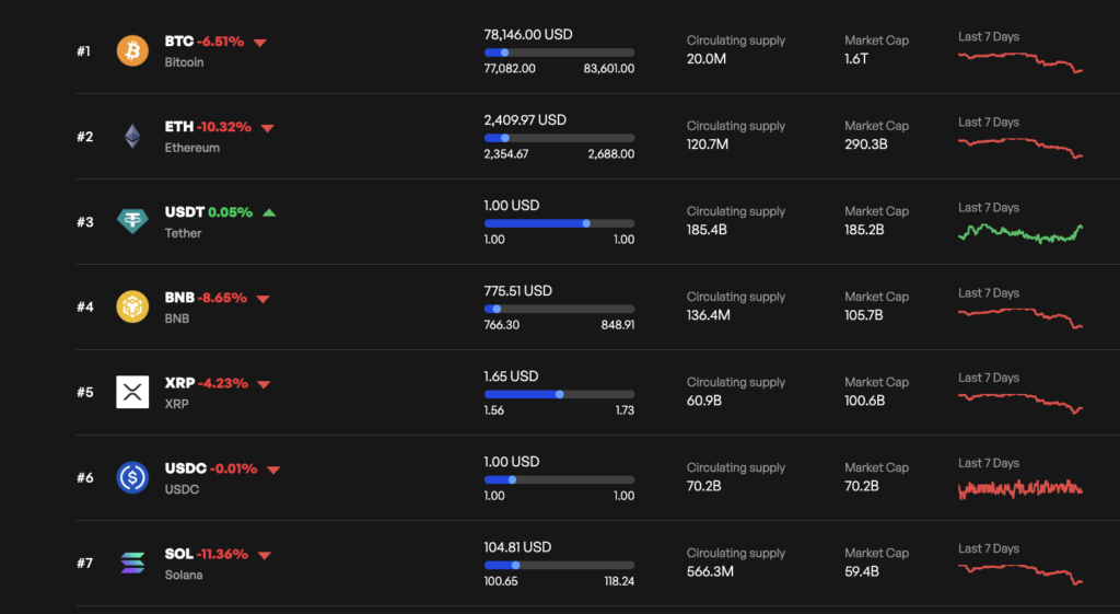 在此背景下,主流加密货币普遍下跌。比特币作为市场上的最大资产,在此期间下跌超过6%,在跌破几个关键技术位后,交易价格接近78,000美元中段。