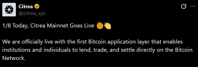 Citrea上线比特币ZK-rollup主网,推出以BTC为担保的借贷、结构化产品及原生美元稳定币ctUSD,将比特币定位为DeFi和支付的基础抵押资产。