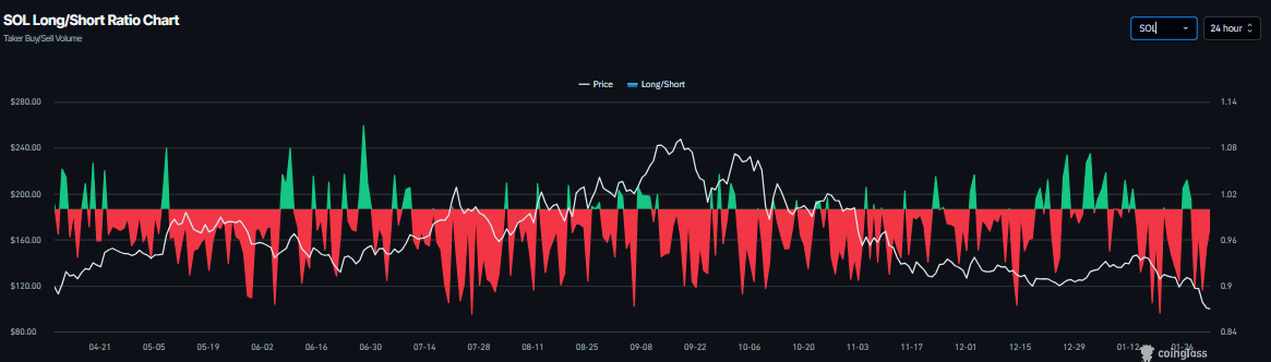 Solana (SOL) 股价延续回调势头,周一跌破 100 美元,此前一周已下跌超过 15%。衍生品数据显示空头头寸增加且资金为负,进一步支撑了股价的下跌趋势。利率从技术角度来看,如果SOL股价日收盘价低于100美元,则可能引发更大幅度的回调。