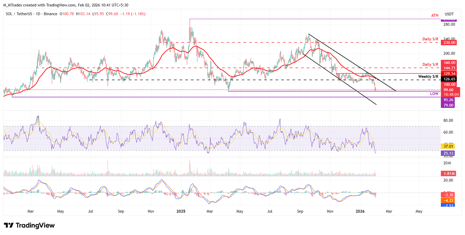 Solana 股价周三在 126.65 美元的周线阻力位受阻,周日跌幅超过 15%,跌破 100 美元的关键心理关口。截至周一,SOL 的交易价格为 99.60 美元。