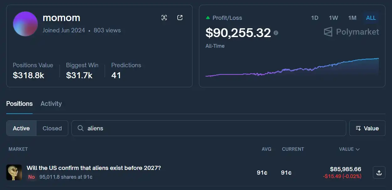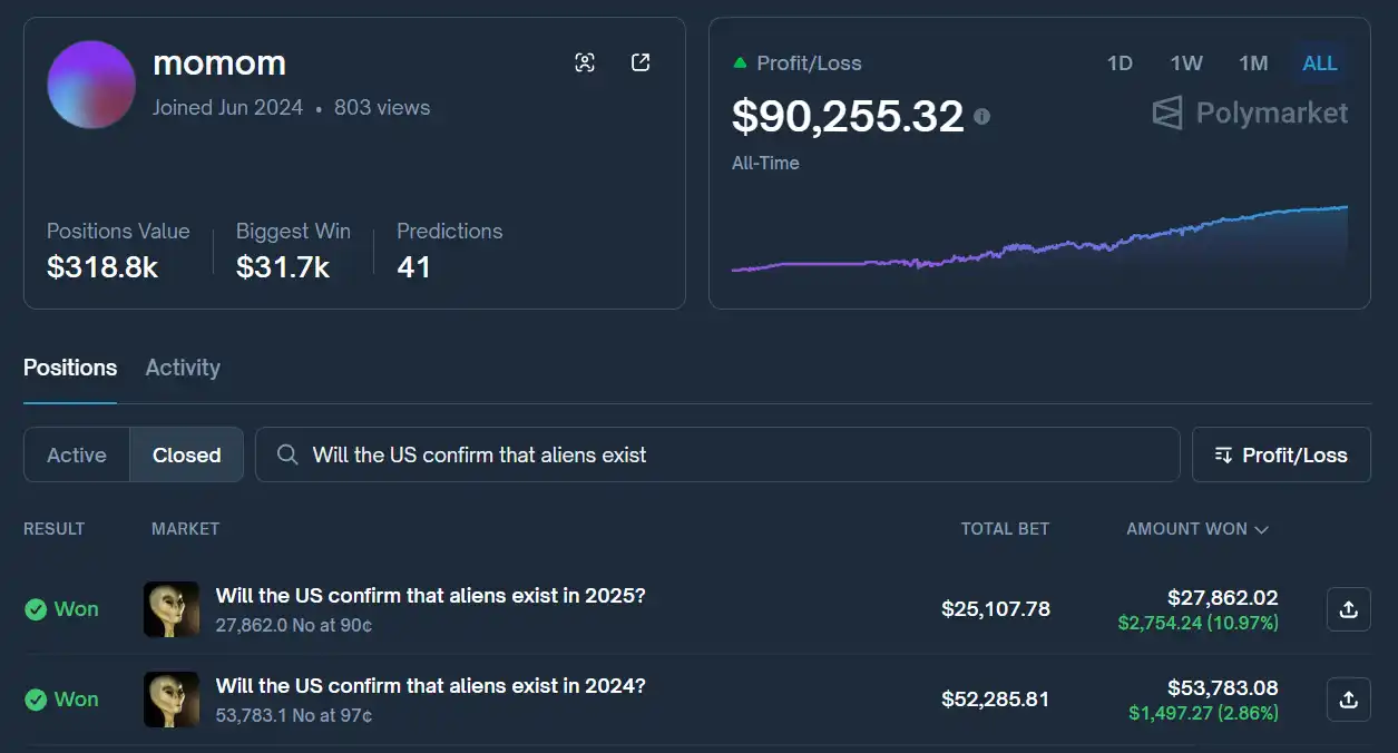 这正是该账号在去年 3 月份的操作:在众多市场杂音和铺天盖地的相关媒体报道下,他在概率为 10% 时押注美国不会在接下来的十个月内宣布外星人存在。这笔交易最终为他带来了 10% 的盈利。