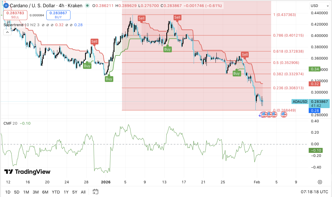 价格走势显示,ADA交易价格低于其超级趋势阻力位,这持续抑制着反弹尝试。值得注意的是,跌破0.333美元附近的0.382斐波那契回调位加剧了抛售压力。这一走势将市场焦点转向更深的回调位。