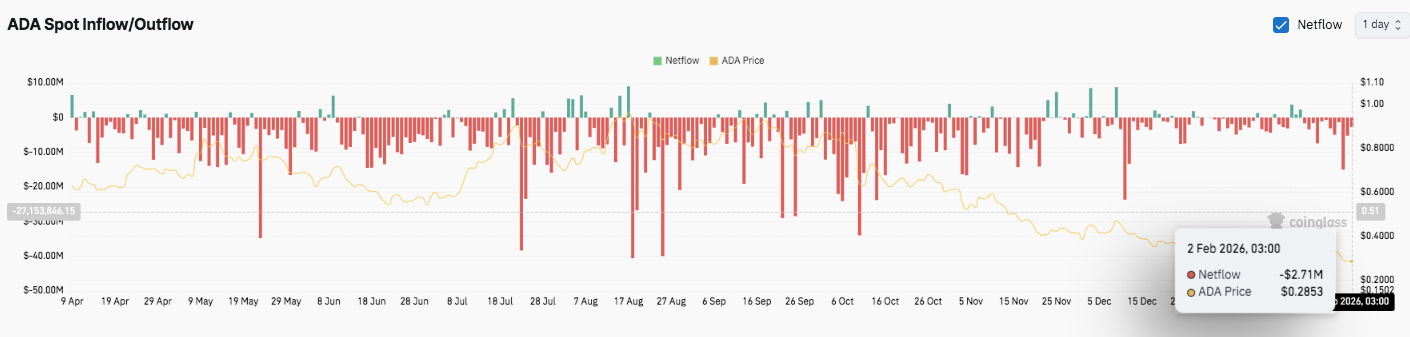 Cardano的短期前景取决于买家能否守住0.268美元的支撑区域并减缓当前的下跌趋势。如果成功守住该区域,价格可能挑战0.308美元至0.310美元的阻力位。然而,如果没有资金流向的转变和动能的确认,上涨尝试可能难以获得动力。