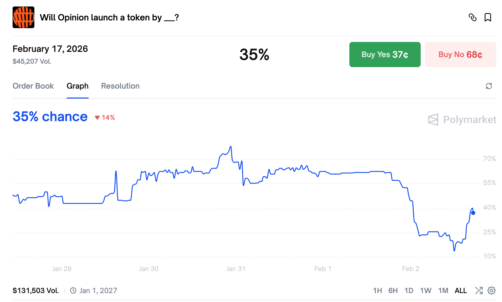 但上周由于行情暴跌,社区成员普遍认为 Opinion 会延迟 TGE 时间。根据 Polymarket 数据,事件“Opinion 将于 2 月 17 日前正式推出治理代币?”的概率从 1 月底超 70% 的概率持续下跌,最低跌破 15%,目前有所反弹,暂报 35%。