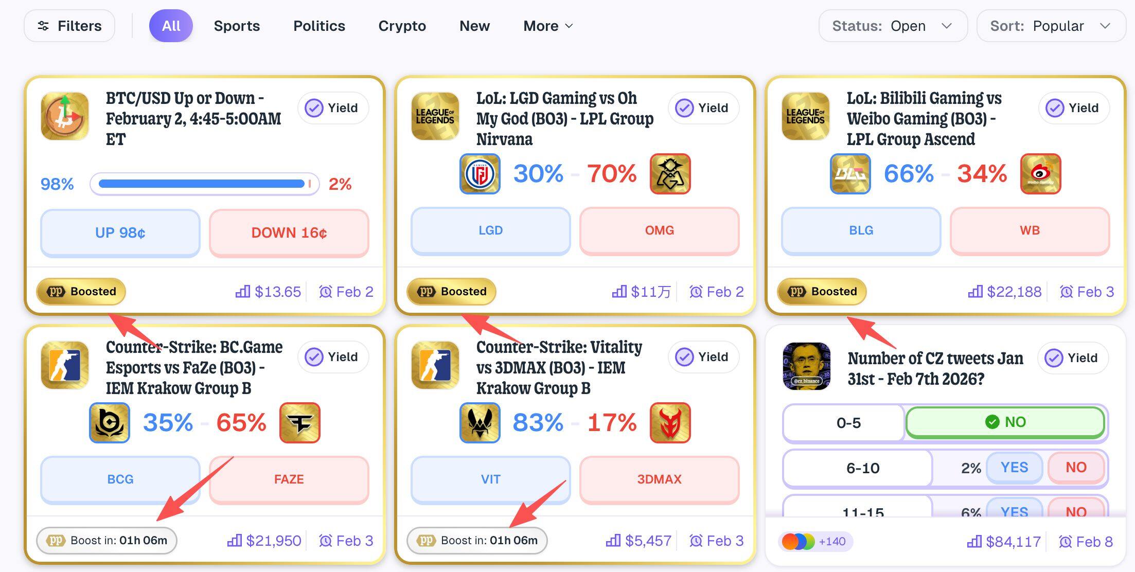 1 月 20 日,predict.fun 宣布上线 Boost 积分加成活动,标有 Boosted 徽章标志的事件会获得更多的积分(具体加成倍数未公布),多为体育赛事。