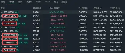 股票代币化、贵金属资产,正在成为交易平台布局的重中之重。从一众中心化交易平台到去中心化平台 Hyperliquid,都已将这条路视作了破局的关键,市场也对此给出了正向反馈——上周贵金属最疯狂的几天,Hyperliquid 上单日白银交易量一度突破 10 亿美元,币股、指数、贵金属等资产一度占据了交易量前十的半壁江山,助推 HYPE 在「全资产交易」的叙事下短线大涨 50%。