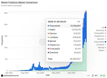 据 Dune 数据,虽然上周末加密行情暴跌,但预测市场交易依旧活跃度不降反增,周交易笔数再创历史新高,达 2639 万次,位居首位的 Polymarket 交易笔数为 1334 万次,紧随其后的 Kalshi 交易笔数为 1188 万次。