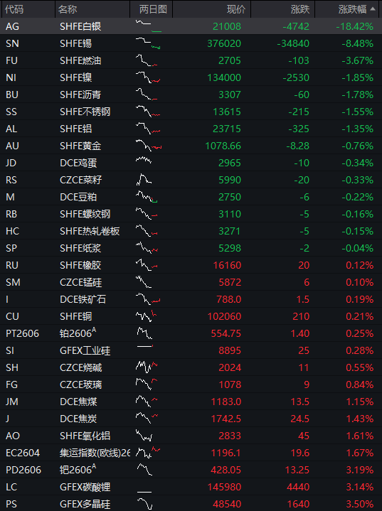 商品期货开盘,沪银主力合约跌近20%,沪锡跌超11%,原油跌超4%,燃料油、铂跌超3%,LU燃油、沪镍跌超2%。集运欧线、氧化铝涨超1%。