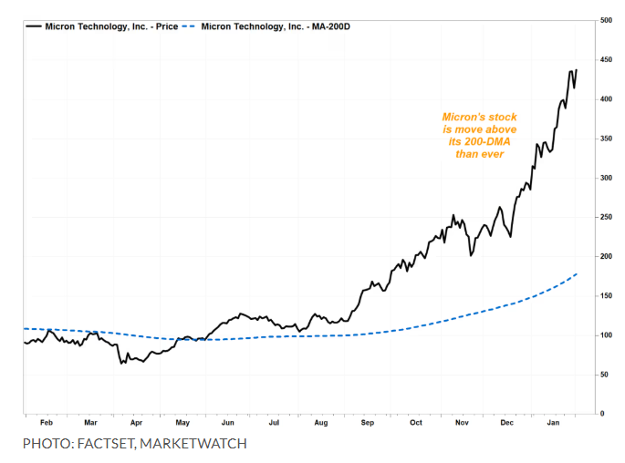 目前美光股价较200日移动均线高出147%,略低于1月28日创下的152%纪录高位。这一广泛使用的长期趋势追踪指标显示,该股已远超历史极值区间。