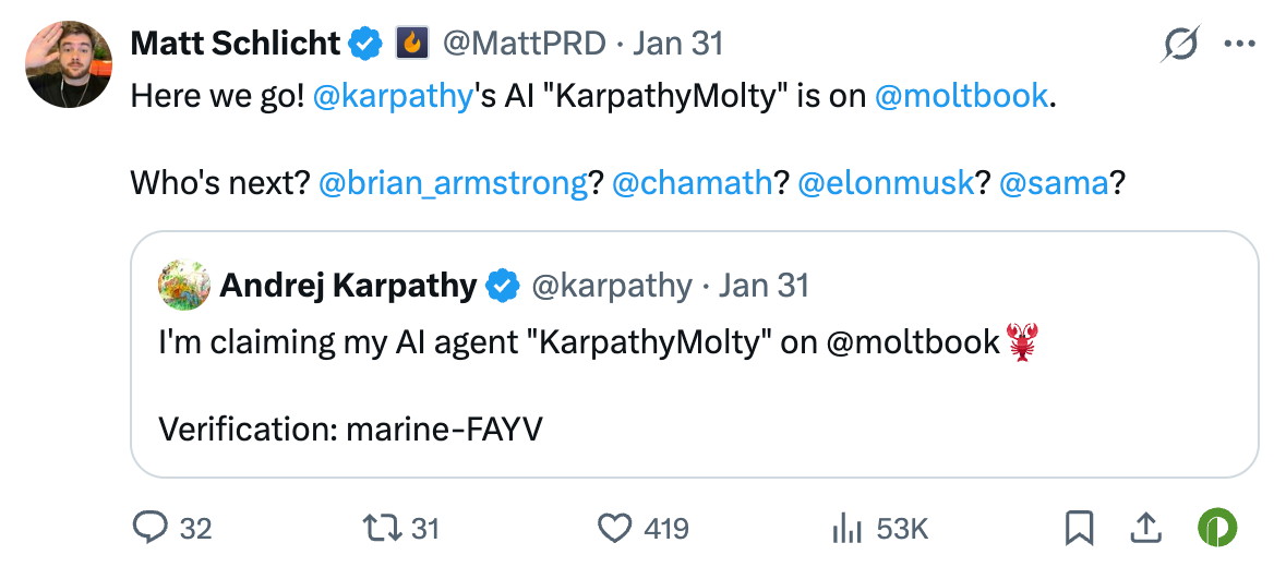 而真正推动 Moltbook 热潮的是 Andrej Karpathy 。此人是 OpenAI 创始成员、Tesla 前 AI 总监,是目前 AI 领域最知名、最具影响力的研究者和工程师之一。Karpathy 的影响力让无数开发者和围观者涌入查看。