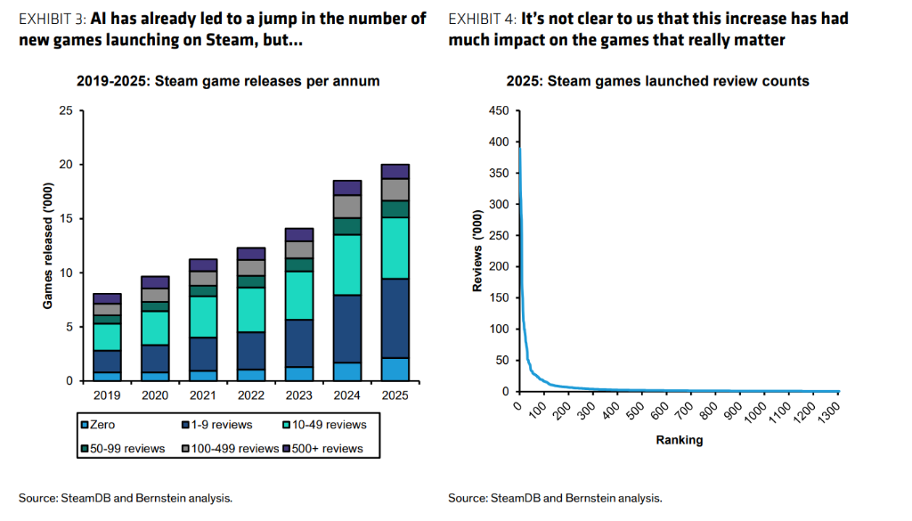 研报数据指出,在2025年发布的海量游戏中,仅有约1,300款游戏获得了超过500条评价;若将门槛提高到10,000条评价,这一数字骤降至仅137款。这说明,尽管AI增加了相对廉价和一次性体验的供应,但并未增加独特、差异化内容的供给。人类大脑对重复体验产生的多巴胺会递减,这意味着仅仅依靠AI生成大量同质化内容无法获得商业成功。