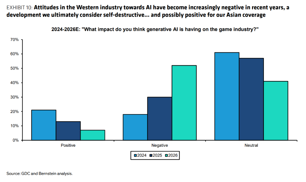 最后,研报提出了一个极其重要的投资视角:全球游戏行业对AI的态度呈现出明显的分化。2026年GDC游戏产业报告显示,西方开发者对AI的态度日益敌对,甚至带有“卢德主义”倾向,这可能导致其在技术迭代中自我毁灭。