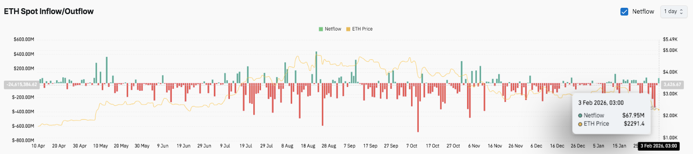 现货资金流动数据也呈现出类似的谨慎态势。在观察期的大部分时间里,以太坊经历了持续的净流出,表明其资金分配较为稳定。尽管近期资金流出有所缓和,但流入依然微弱。此外,近期出现的正净流入表明市场处于早期企稳阶段,而非持续积累阶段。