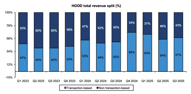 尽管存在这些不利因素,但伯恩斯坦分析师表示,Robinhood 更广泛的业务组合有助于抵消加密货币交易活动的疲软。该公司强调了股票交易、预测市场和银行服务方面的增长,并指出非交易收入目前约占总收入的 43%,且过去两年的复合年增长率约为 29%。