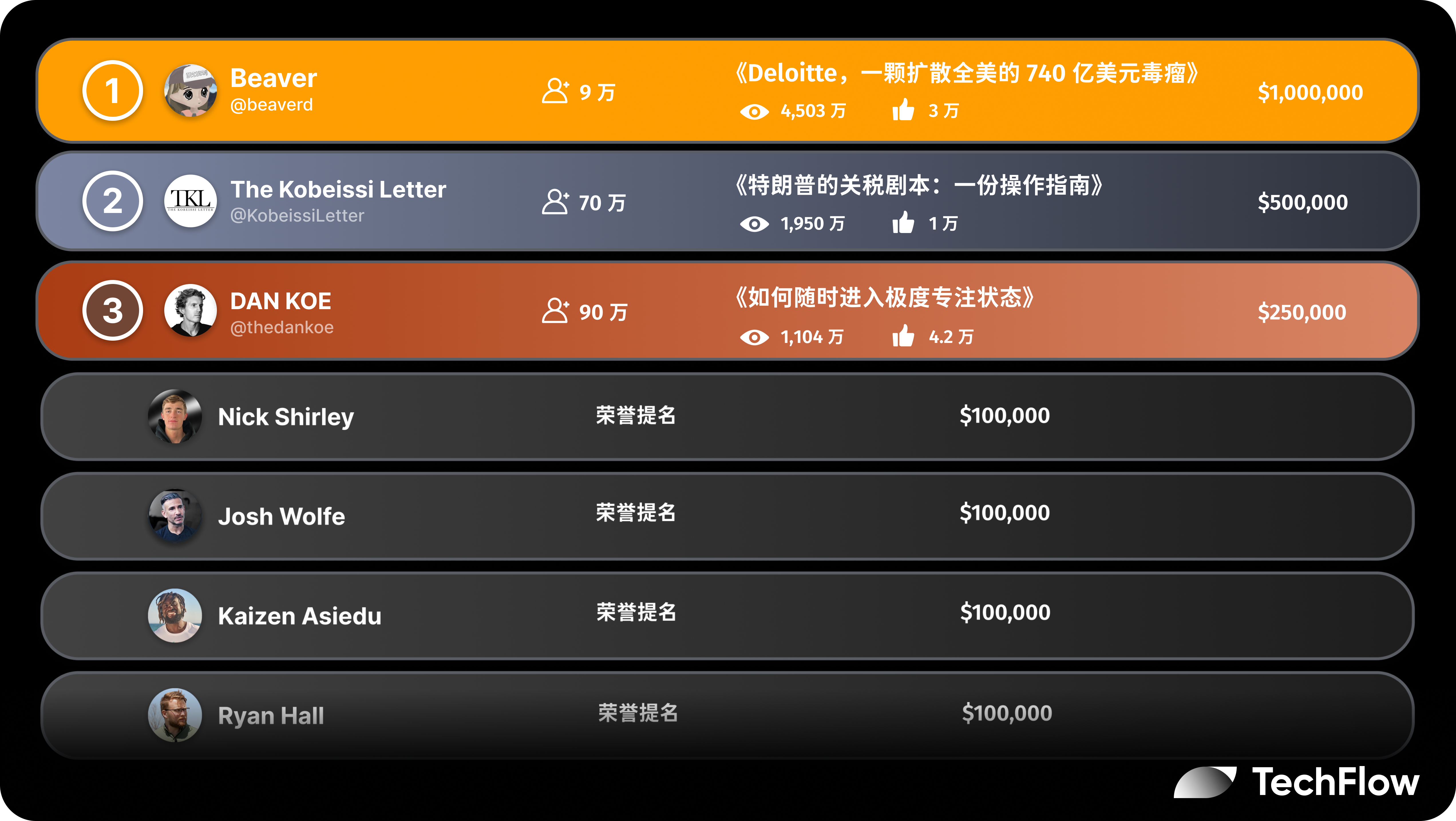 你可以看到 Dan Koe 又上榜了。不过,他之前那篇如何用一天修复人生的文章有 1.7 亿曝光,但这次创作比赛的冠军只有 4500 万。