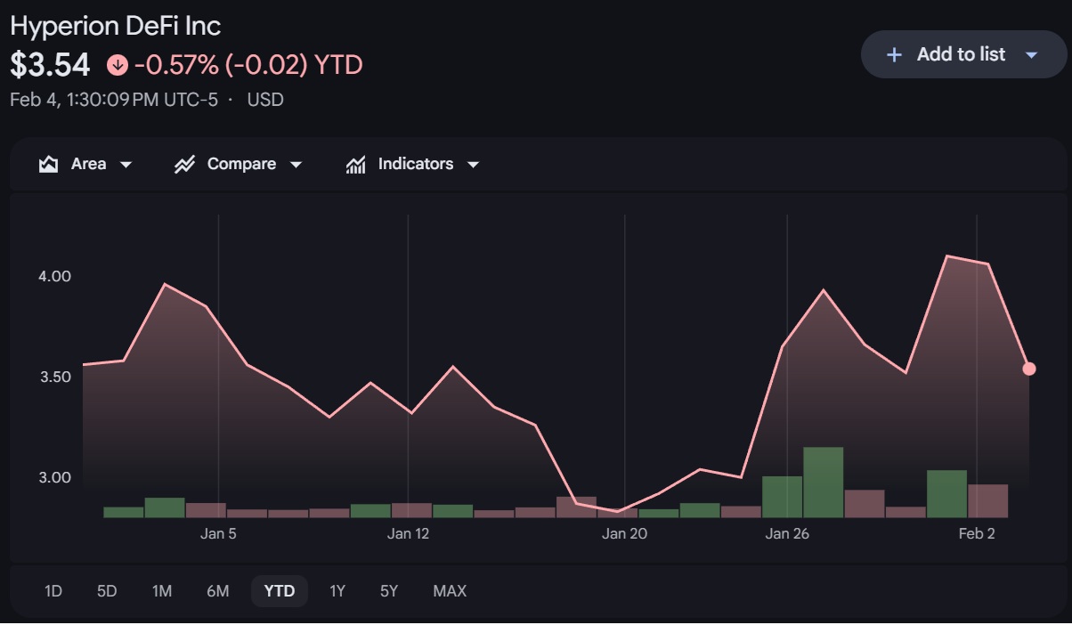 据谷歌财经数据显示,消息公布后,HYPD 股价下跌超过 13%,至 3.50 美元左右,原因是更广泛的加密货币抛售潮导致加密货币总市值蒸发近 7500 亿美元。