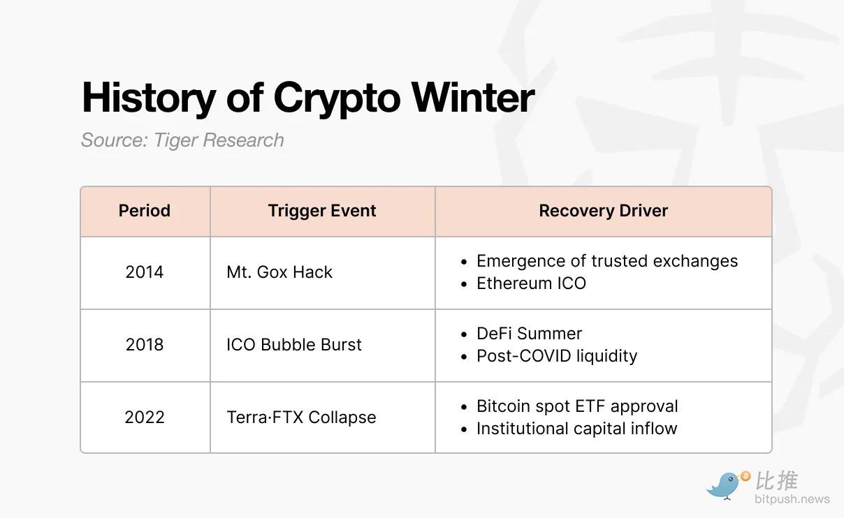 然而,很难将当前定义为典型的“加密寒冬”。 过去的寒冬爆发于行业内部——Mt. Gox 被黑、ICO 归零、FTX 暴雷,这些都是行业自毁长城。