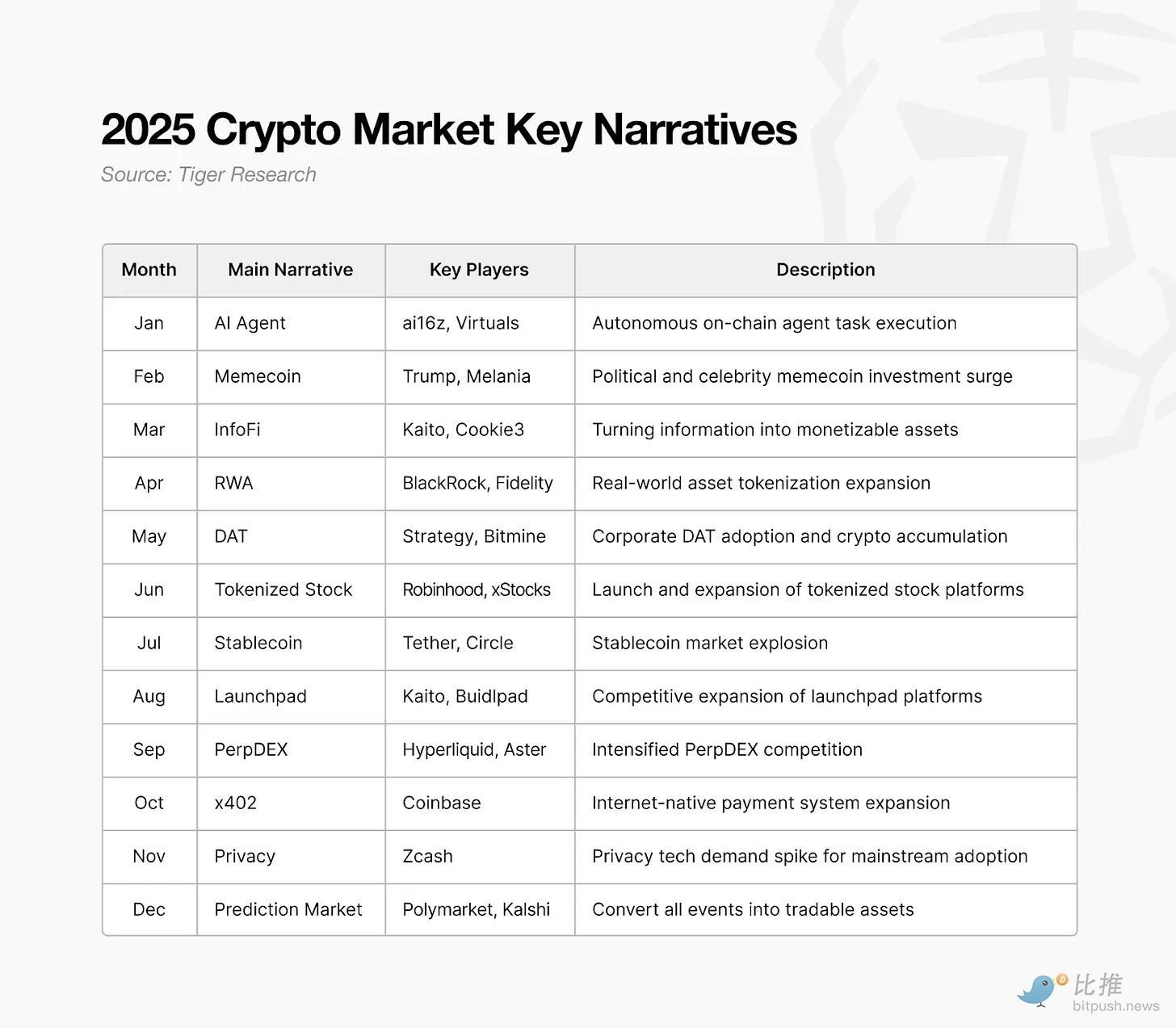 RWA(现实世界资产)、perpDEX(永续合约交易所)、预测市场、InfoFi、隐私协议等新叙事层出不穷,且仍在持续迭代。虽然它们没有像当年的 DeFi 那样拉动全盘上涨,但它们并未消失。行业基本面没有崩溃,只是外部环境变了。