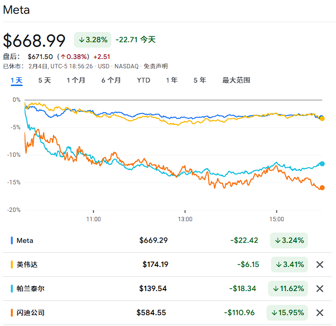 同时,Palantir下跌12%,数据存储公司SanDisk下挫16%。这波针对SaaS股票的抛售潮也波及了数家AI巨头,Meta本周已下跌6.6%,而英伟达下跌了8.9%。