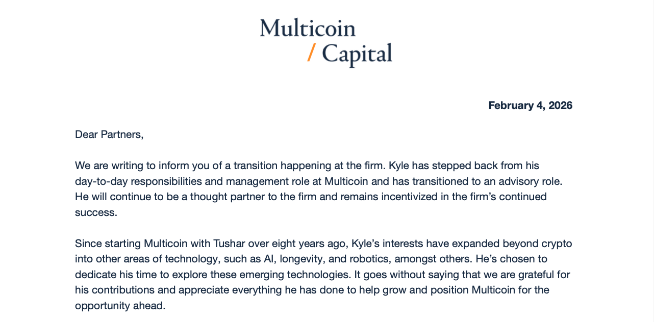 当地时间 2 月 4 日,业界知名风投机构 Multicoin Capital 致信 LP 表示,联合创始人兼管理合伙人 Kyle Samani 已卸任其在 Multicoin 的日常职责与管理职务,并转为顾问角色。