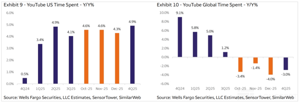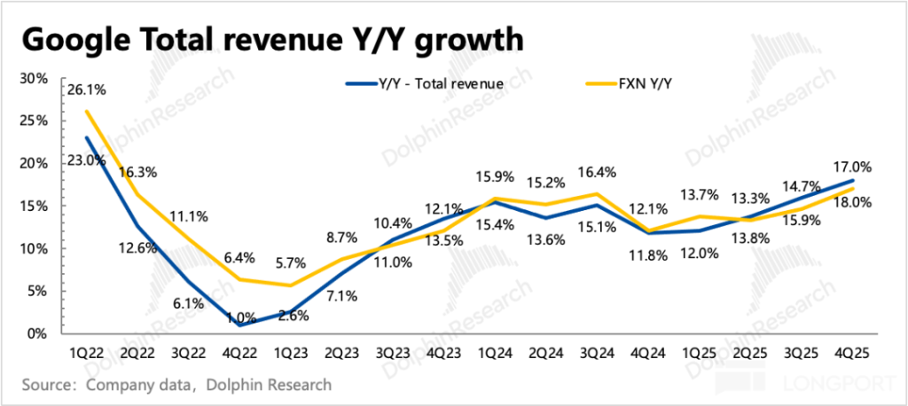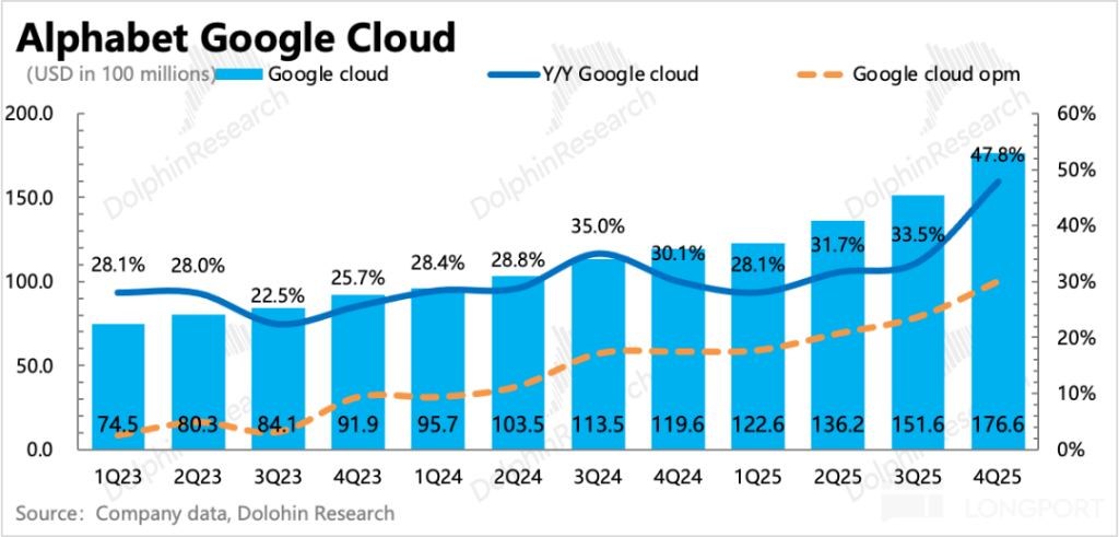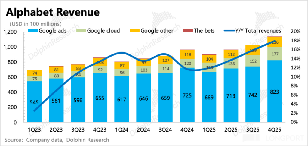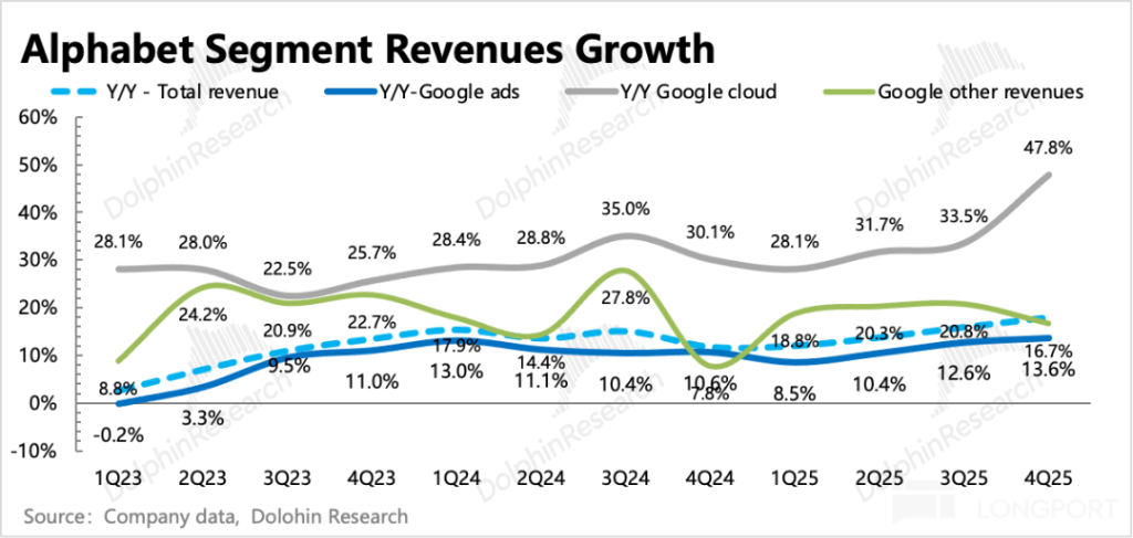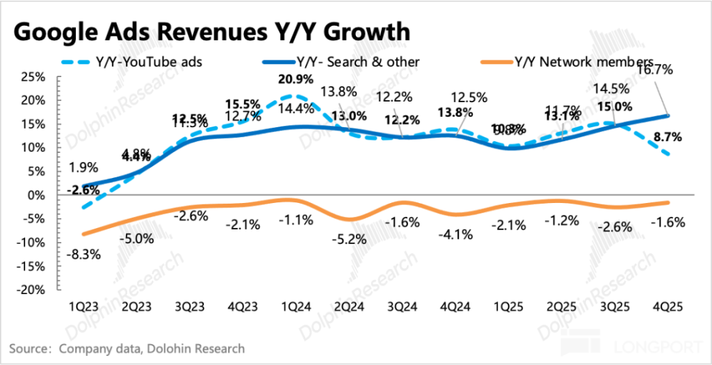 四季度广告收入823亿美元,整体增长13.6%。核心搜索继续加速增长至16.7%,强势的Gemini 3加持下,带动整体搜索继续回击AI颠覆论。但YouTube广告本季度却意外放缓,海豚君认为,可能与Shorts还没猛拉变现、YouTube TV的品牌广告在四季度承压带来。