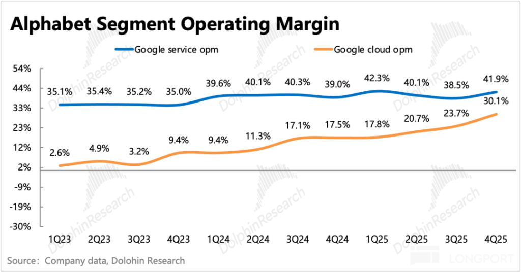分业务来看,不仅谷歌服务业务环比走高,云业务利润率也进一步提高至30%,而市场原本预期在投入压力下利润率走平就不错了。