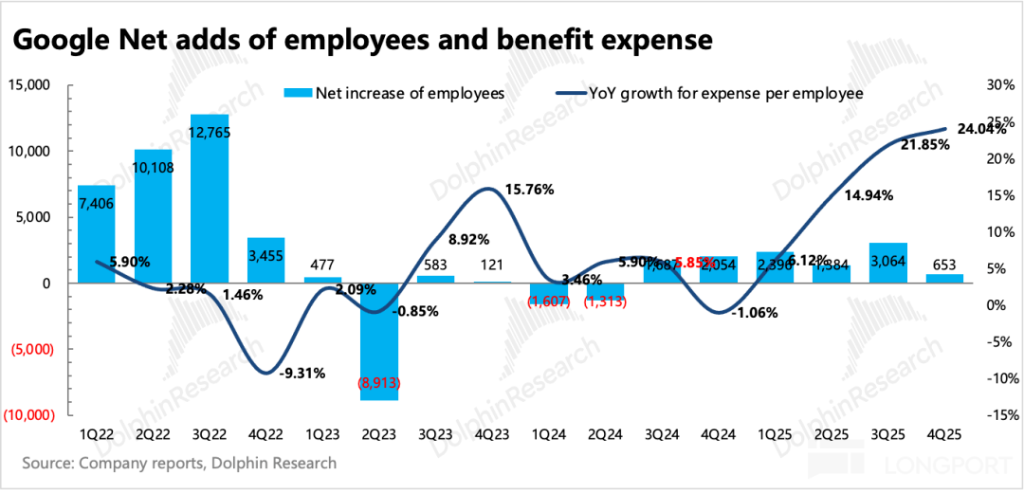 预计随着26年天量Capex花出去,如果不做控制,总支出马上会飙涨。因此谷歌的人员调整还会继续,现在Q4净增员工数已经相较前三季度大大减少至650人。