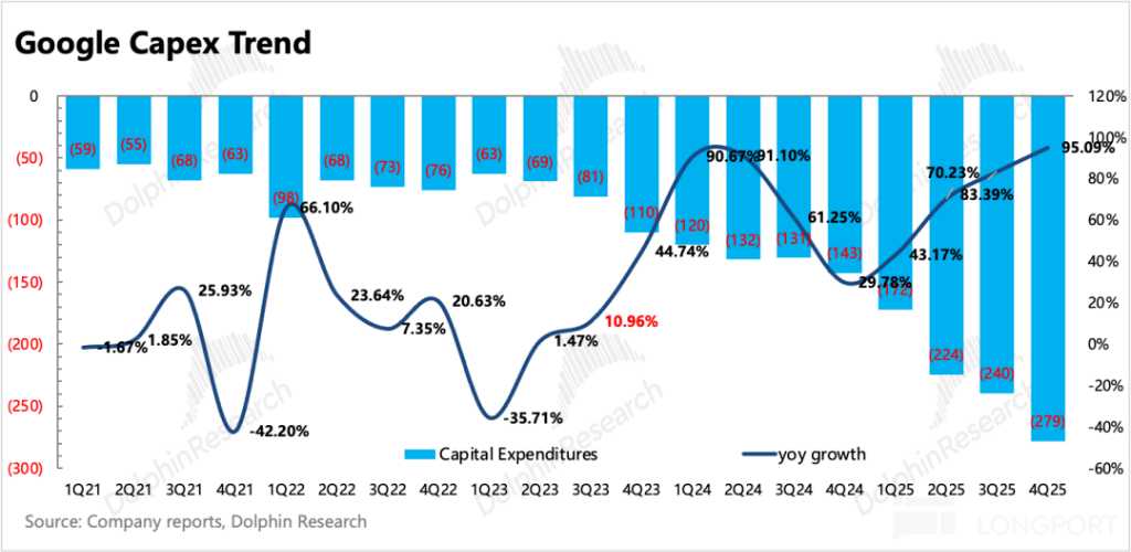 四季度资本开支280亿,符合市场预期。但公司展望明年资本开支在1750-1850亿区间,远超市场预期的1200-1300亿,相当于翻倍增长。在惊讶于谷歌画风突转的同时,考虑到管理层较少盲投黑历史,我们对谷歌AI的实际强劲的需求也提高了一些信心。